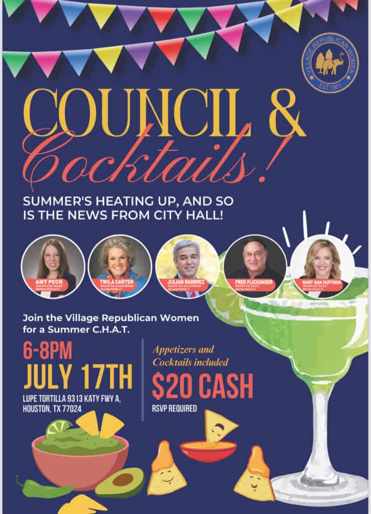 Events VRW SUMMER C.H.A.T. – COUNCIL AND COCKTAILS (Members Only And Their Guest) July 17 6 PM - 8 PM Lupe Tortilla's 9313 Katy Fwy A, Houston Get Directions Share Tweet